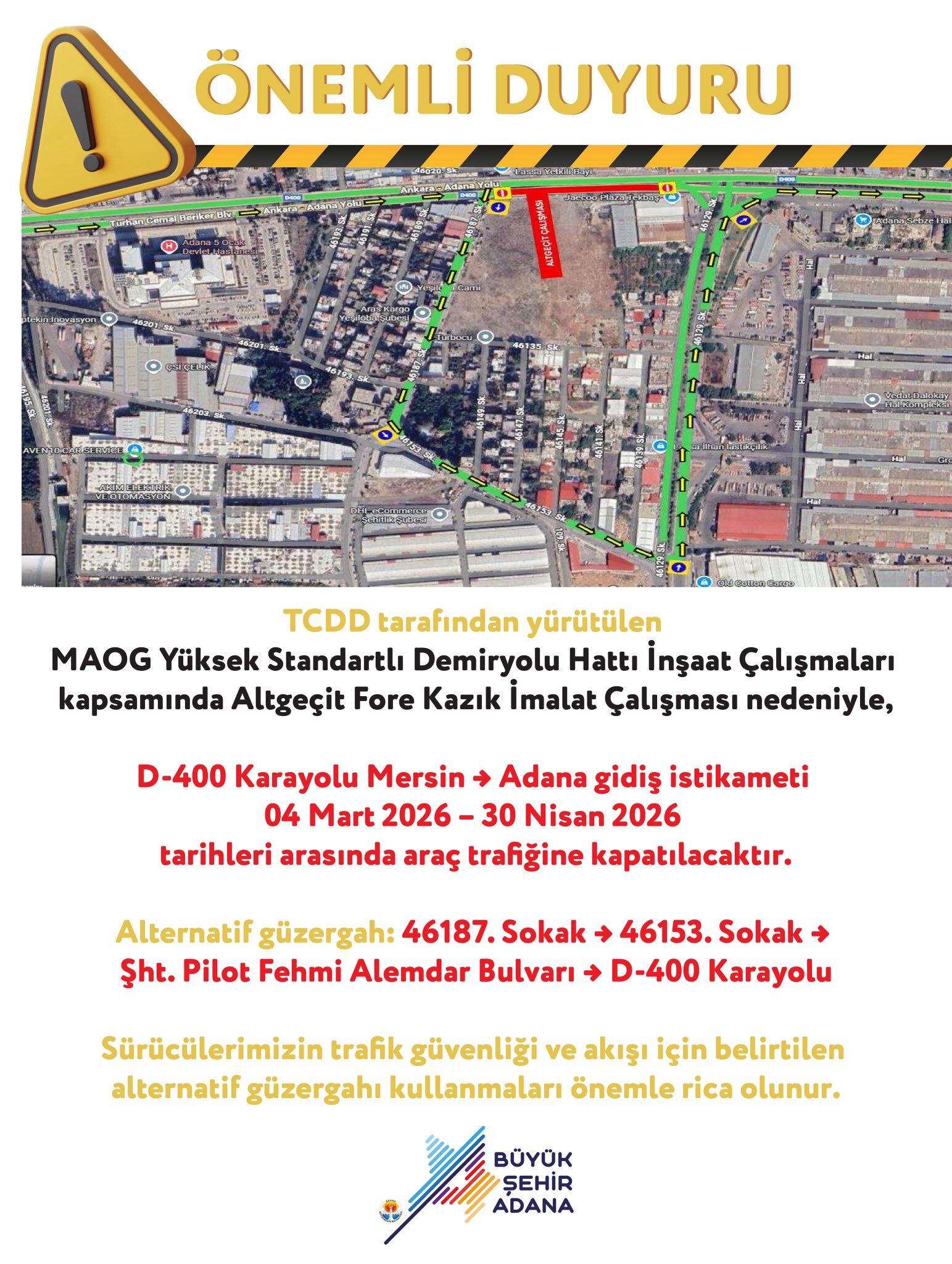 TCDD tarafından yürütülen MAOG (Mersin-Adana-Osmaniye-Gaziantep) Yüksek Standartlı Demiryolu Hattı İnşaat Çalışmaları hız kesmeden devam ediyor. Bu proje çerçevesinde yapılacak olan "Altgeçit Fore Kazık İmalat Çalışması" sebebiyle trafik akışında zorunlu bir değişikliğe gidiliyor. Yapılan açıklamaya göre, D-400 Karayolu'nun Mersin - Adana gidiş istikameti araç trafiğine kapatılacak.